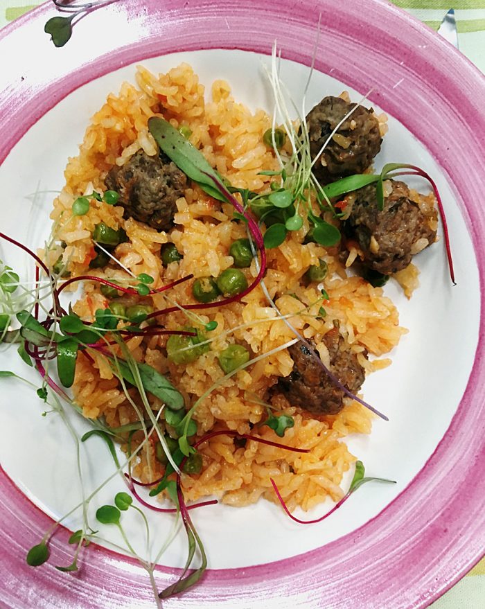 Arroz caldoso com almôndegas