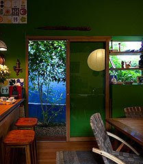 Com a cozinha como ambiente central da casa, nada mais natural que deixá-la aberta, integrada a outros espaços. O quarto de hóspedes, por exemplo, pode ser anexado ao espaço abrindo as portas de correr japonesas. Logo depois da cozinha, uma varanda charmosa faz as vezes de sala de jantar em dias ensolarados.