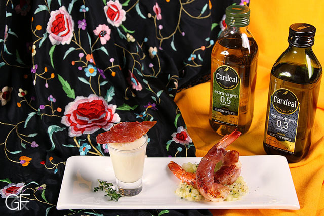 Preparei 3 receitinhas simples para começar a conversa sobre azeite: camarão rosa com jamon e gazpacho de melão, pan con tomates e um trio de azeites aromatizados.