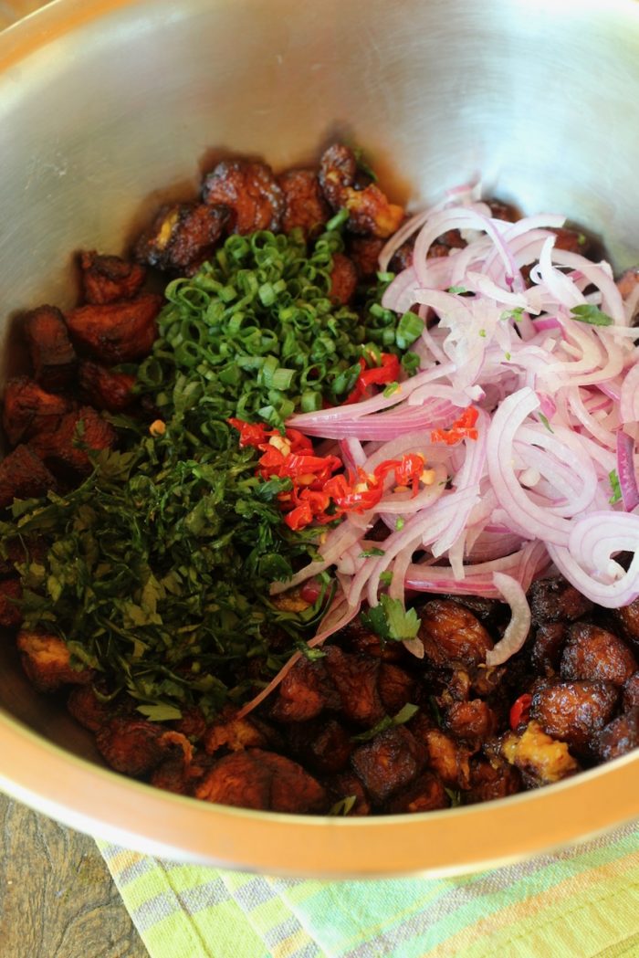 Essa salada de banana frita fazia tanto sucesso nos almoços da Feed que acabou fixa no menu. E ainda fazíamos a versão com batata doce frita.