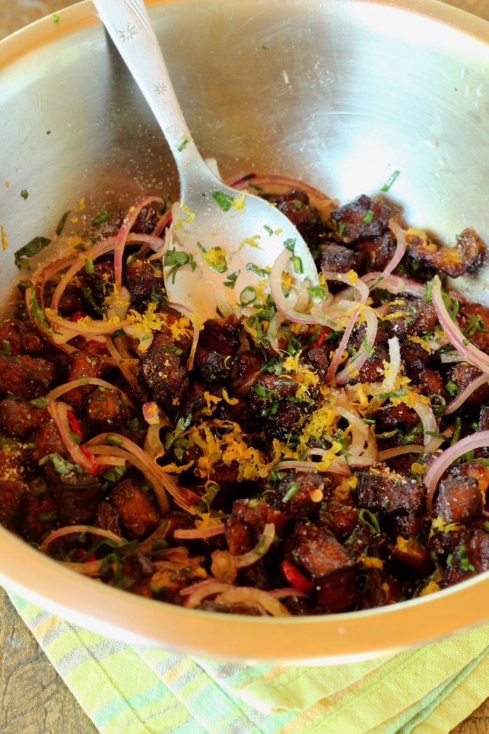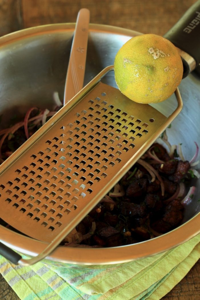 Misture com cebola roxa laminada, muita pimenta e cheiro verde (coentro ou salsinha a gosto da freguesia). Tempere com raspas e algumas gotinhas de limão e sal.