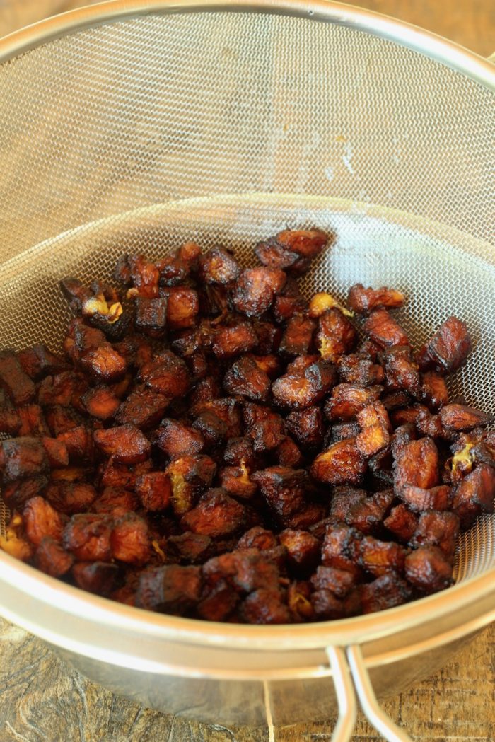 Corte a banana da terra em cubinhos e separe bem os cubinhos antes de fritar, eles costumam ficar grudados uns nos outros. Frite por imersão em óleo quente, escorra e separe novamente os cubinhos. Reserve.
